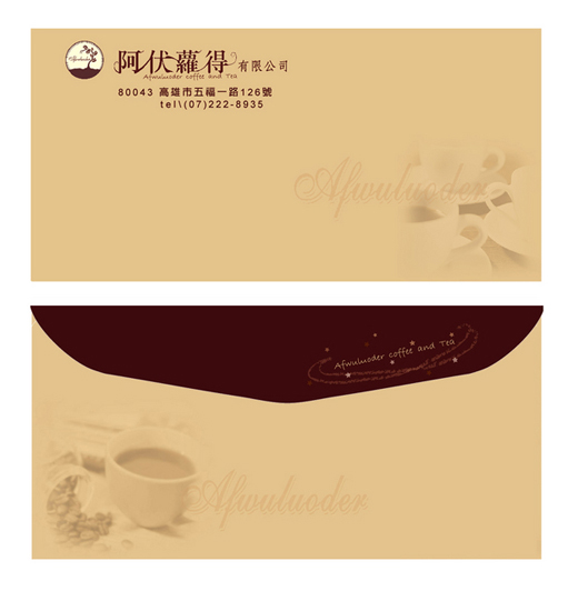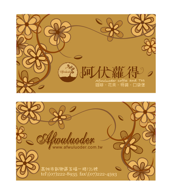 阿伏蘿得咖啡店客戶指定和花草有關,名片正面做特殊燙古銅金處理(LOGO和部分花心處),杯墊開刀模